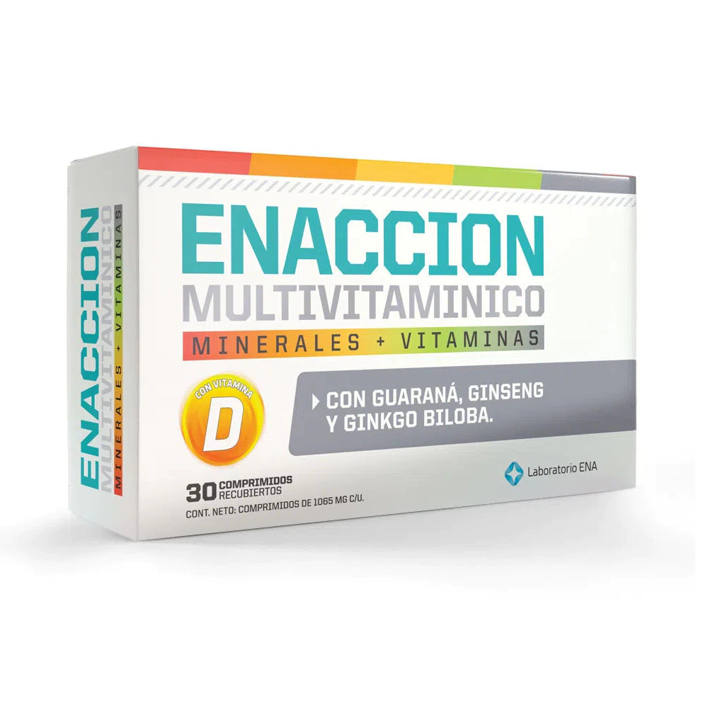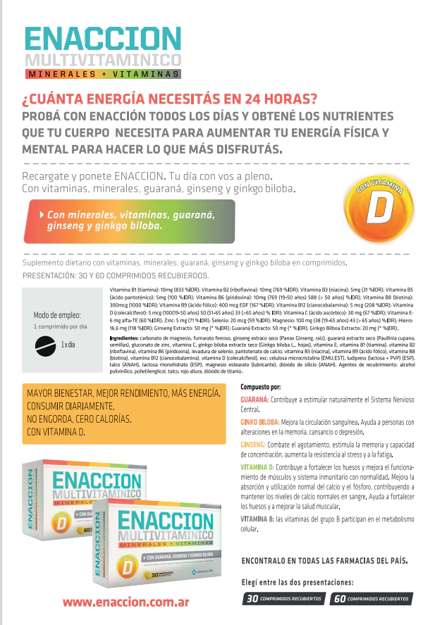 ENACCION combina vitaminas, minerales, ginseng, guaraná y ginko biloba que ayudan a mejorar el bienestar y el rendimiento diario.
