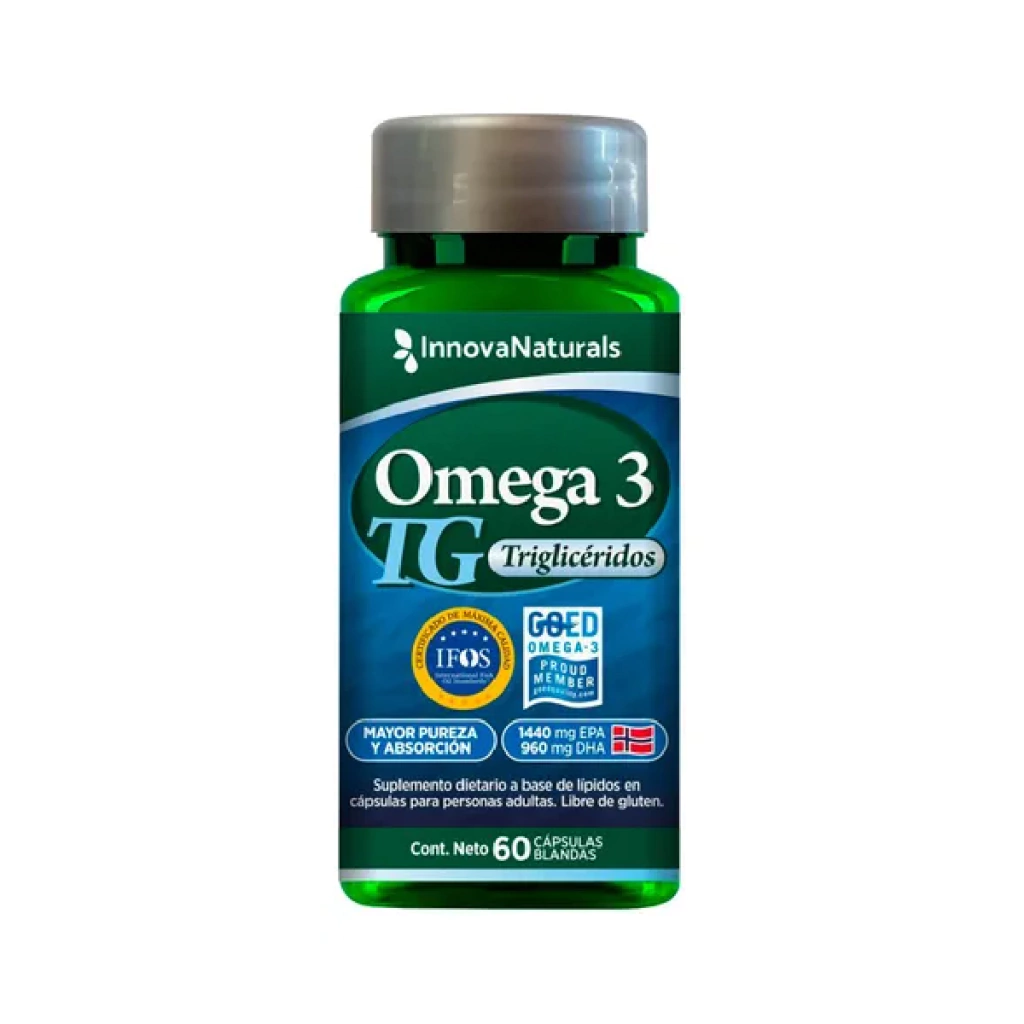 Omega 3 TG de InnovaNaturals es un suplemento dietario premium, formulado con ácidos grasos Omega 3 en forma de triglicéridos naturales, lo que garantiza una absorción superior y mayor biodisponibilidad. Su fórmula contiene alta concentración de EPA y DHA, dos compuestos esenciales para la salud cardiovascular, cerebral y articular. Este producto tiene certificaciones internacionales IFOS y GOED, que aseguran pureza, potencia y ausencia de contaminantes como mercurio, dioxinas y metales pesados.