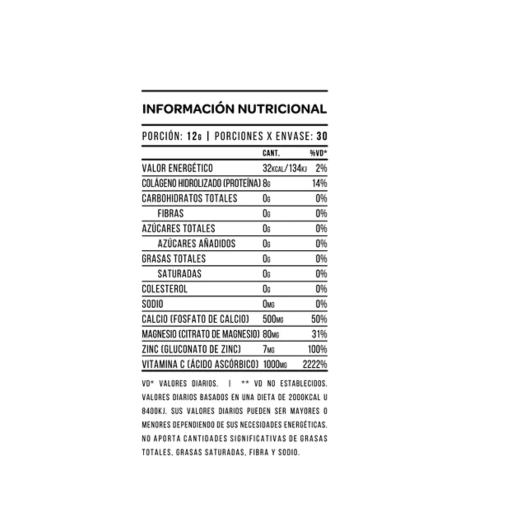 Colágeno hidrolizado, Fosfato de Calcio, Vitamina C (Acido Ascórbico), citrato de magnesio, Gluconato de Zinc, Sabor Limón. Libre de Gluten. Sin TACC.
